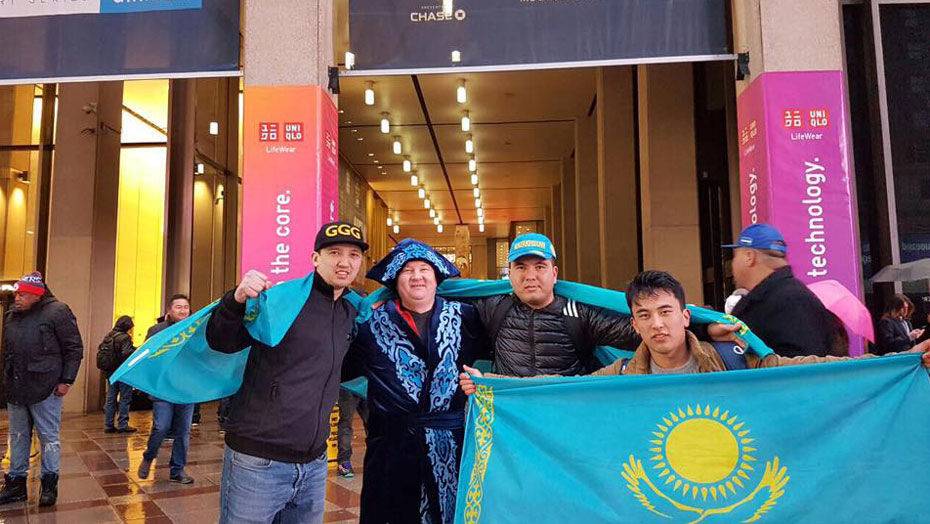 Сотни болельщиков Геннадия Головкина пришли на его бой с Дэниэлом Джейкобсом на Madison Square Garden, взяв с собой флаги Казахстана, а многие надели традиционные казахские чапаны.