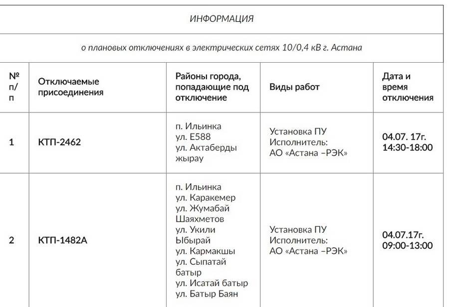 Акимат Астаны сообщил, в каких районах города 4 июля пройдёт плановое отключение электричества. Информация указана на сайте столичного акимата.