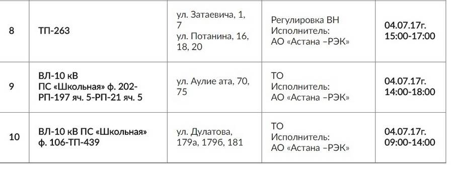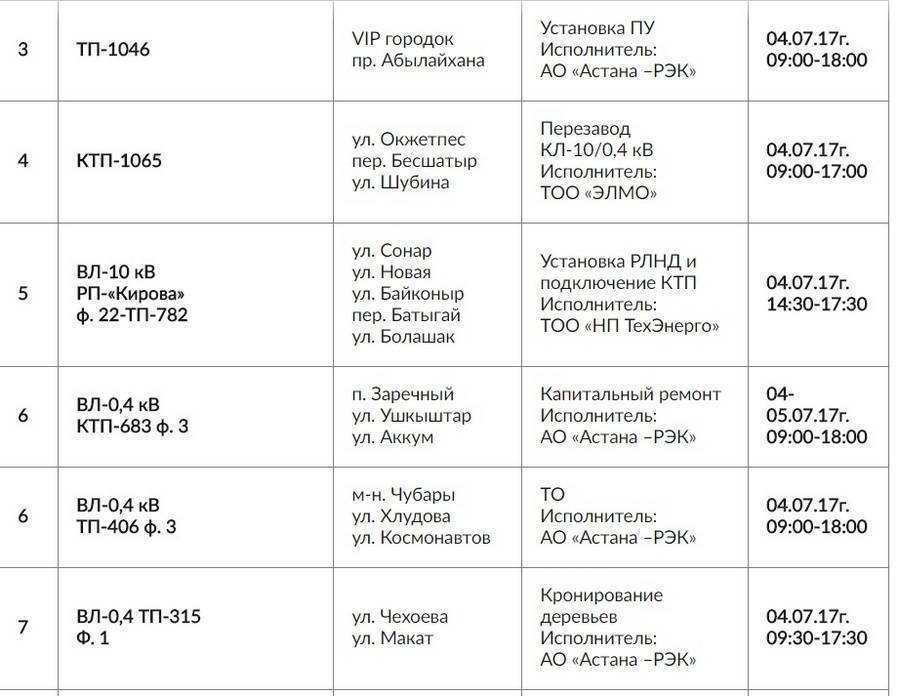 В таблице, представленной ситуационным Центром акимата Астаны, указаны названия улиц, вид ремонтных работ и время, на которое электричество будет отключено. Часть работ займёт весь рабочий день, на некоторых участках ремонтникам понадобится несколько часов.
