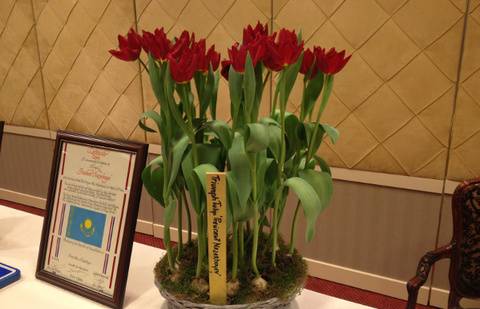 По завершению двусторонней встречи, руководитель нидерландской нефтегазовой корпорации подарил Главе государства новый сорт тюльпанов "Президент Назарбаев". Их вывели в прошлом году, когда лидер нации посещал саммит по ядерной безопасности в Нидерландах.