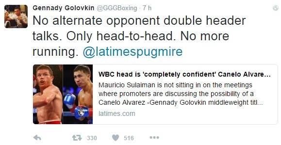 "Никаких переговоров с участием заместителей или представителей. Только лицом к лицу. Хватит бегать", – написал GGG в микроблоге.