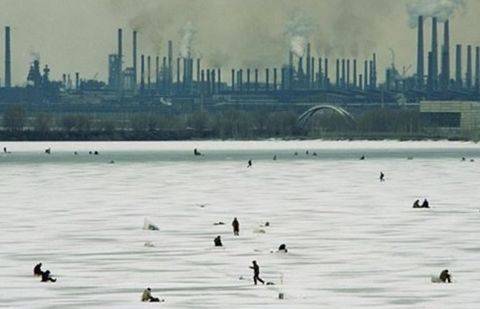 Рыбаки занимаются подлёдным ловом на реке Урал. Рядом расположен самый крупный Магнитогорский металлургический комбинат.