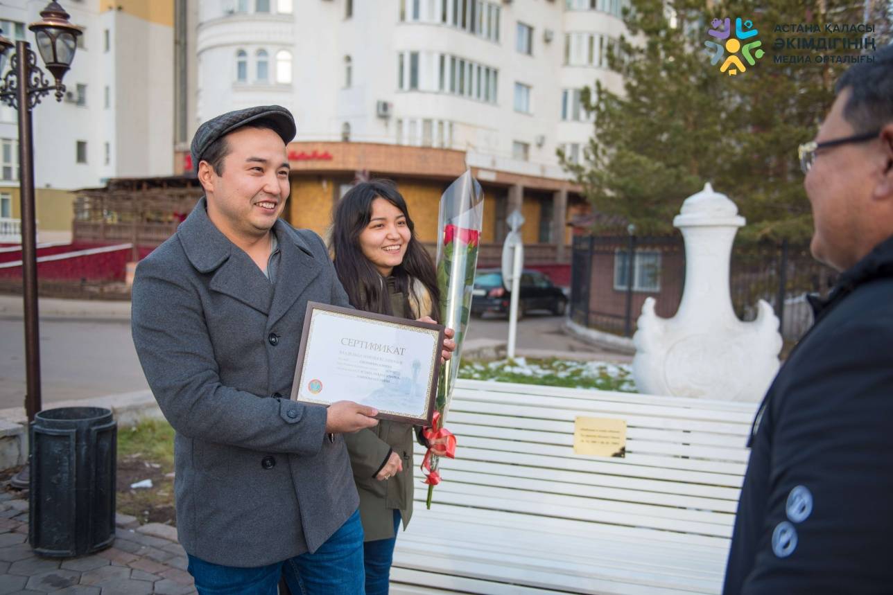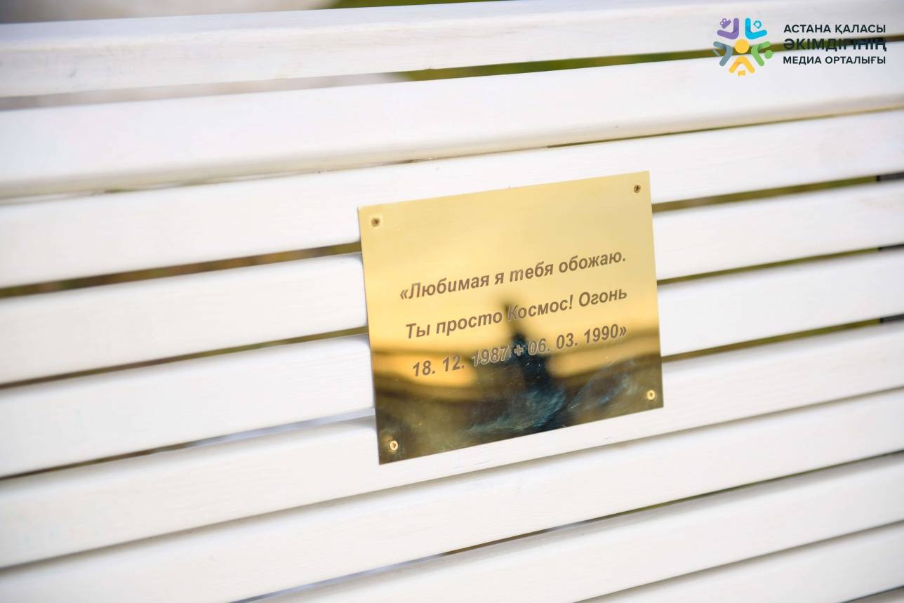 Одним из первых, кто необычно признался в любви своей супруге, стал местный житель Алибек Сисембин. Сегодня скамейку, купленную им, может увидеть любой прохожий на центральной набережной Астаны.