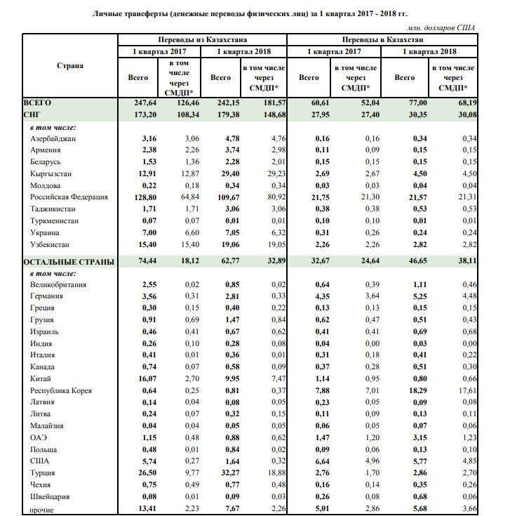 При этом из 242 млн долларов, переведённых из Казахстана, 179 млн долларов были отправлены в страны СНГ. На первом месте по объёму средств находится Россия (109,67 млн долларов), на втором Кыргызстан (29,40 млн долларов) и на третьем – Узбекистан (19,06 млн долларов). В структуре других стран больше всего денег было переведено в Турцию (32,27 млн долларов), а также Китай (9,95 млн долларов) и Германию (2,81 млн долларов).