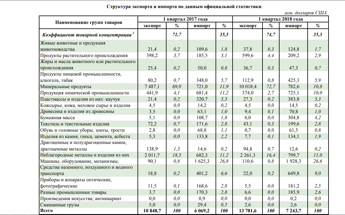 Официальный экспорт товаров составил 13,8 млрд долларов, что на 27% выше показателя 1 квартала прошлого года. Стоимость экспорта нефти и газового конденсата составил 59,8% от общей стоимости официального экспорта, что на 35,5% больше в сравнении с аналогичным периодом прошлого года. Рост, по данным аналитиков Нацбанка, произошёл за счёт увеличения контрактных цен и объёмов физических поставок.