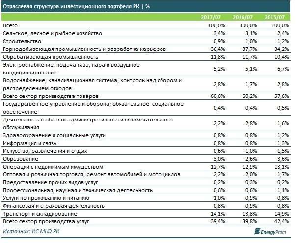Отраслевая структура привлечённых инвестиций свидетельствует о снижении интереса и к сервисной экономике. Удельный вес услуг в портфеле за два года сократился на 3% до 39,4. Между тем в этом секторе наблюдается наибольший рост рабочих мест. По итогам первого полугодия 2017 года в сервисном сегменте экономики работают почти 5,5 млн человек – это 64,2% от всего занятого населения Казахстана.