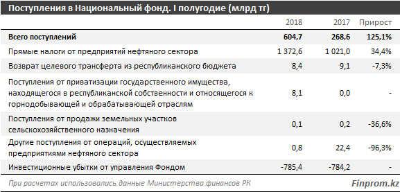 За первое полугодие 2018 года поступления в Нацфонд увеличились более чем в два раза по отношению к аналогичному периоду годом ранее и составили 604,7 млрд тенге.