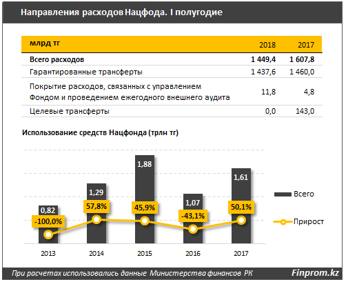 Несмотря на заметный рост поступлений в Нацфонд, расходы фонда сократились на 9,9% – с 1,6 до 1,4 трлн тенге. Максимальные расходы за первое полугодие были зафиксированы в 2015 году, тогда из средств фонда на покрытие совокупных расходов было выделено 1,9 трлн тенге.