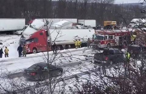 Массовое столкновение произошло на участке дороги близ города Лебанон. Судя по кадрам с места событий, трасса сильно заснежена.