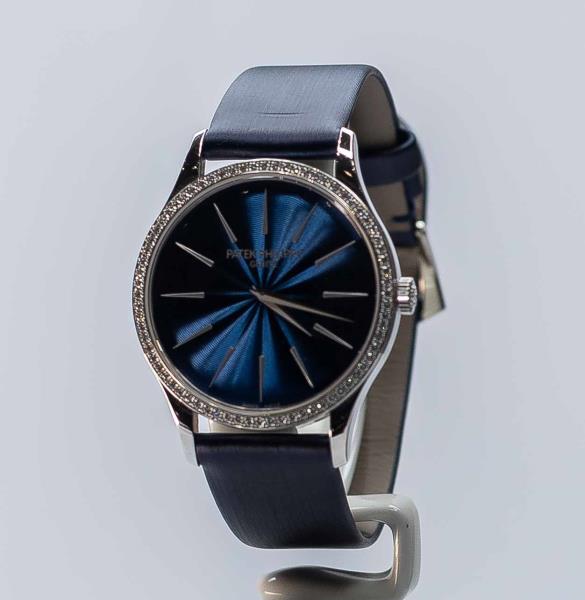 На Patek Philippe Calatrava стартовая цена установлена в 7 млн тенге. Безель инкрустирован 76 бриллиантами общим весом 0,55 карата. Задняя крышка выполнена из сапфирового стекла.
