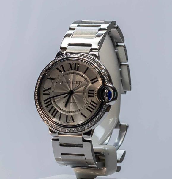 На Cartier Ballon Bleu стартовая цена превышает 1 млн тенге. Безель выполнен из стали, инкрустирован 54 бриллиантами.
