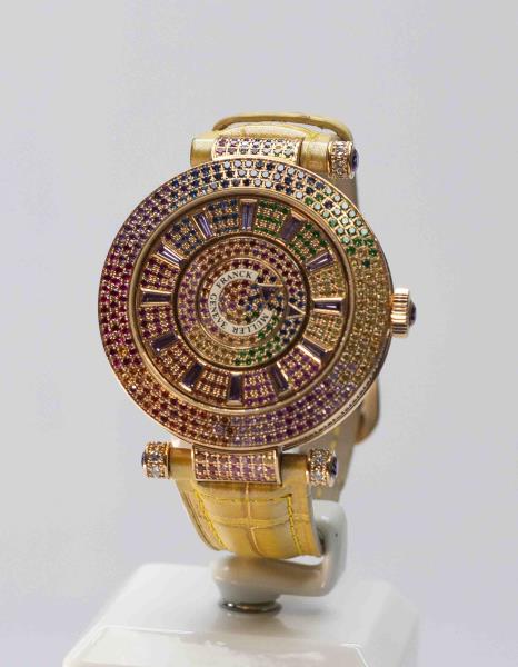 Наручные часы Frank Muller Geneve оценили в 20 млн тенге. Корпус выполнен из розового золота, циферблат инкрустирован рубинами, сапфирами и цаворитами, рубиновые стрелки. Имеются царапины на корпусе, ремешок повреждён.