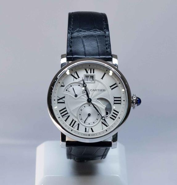 Ещё один лот – Cartier Rotonde de Cartier, стартовая цена превышает 1 млн тенге. Корпус из стали, рифлёная заводная головка украшена синтетической шпинелью, посеребрённый циферблат, стрелки в форме яблок из воронёной стали, сапфировое стекло, двойная регулируемая раскладывающаяся стальная застёжка.