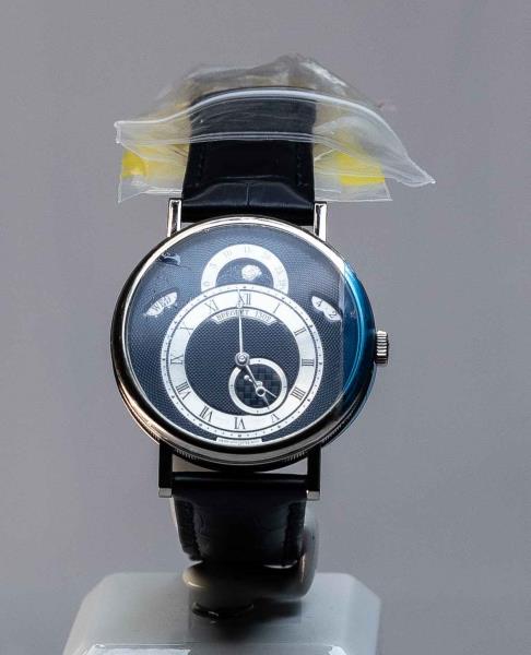 Стартовая цена на часы Breguet 3099 BE – 10 млн тенге. Корпус состоит из белого золота весом 18 карат. Безель (кольцо вокруг циферблата) и ушко (выступ на корпусе, к которому крепится ремешок) украшены 139 бриллиантами классической огранки (около 1255 карат). Заводная головка украшена бриллиантом (около 0,26 карата). Задняя крышка выполнена из сапфирового стекла. Часы имеют царапины на корпусе, ремешок повреждён.