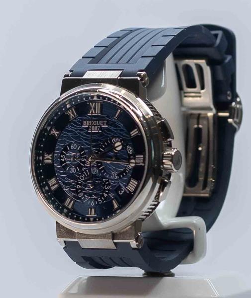 Стартовая цена наручных часов Breguet Marine Chronograph – более 6 млн тенге. Они сделаны из белого золота и сапфирового стекла.