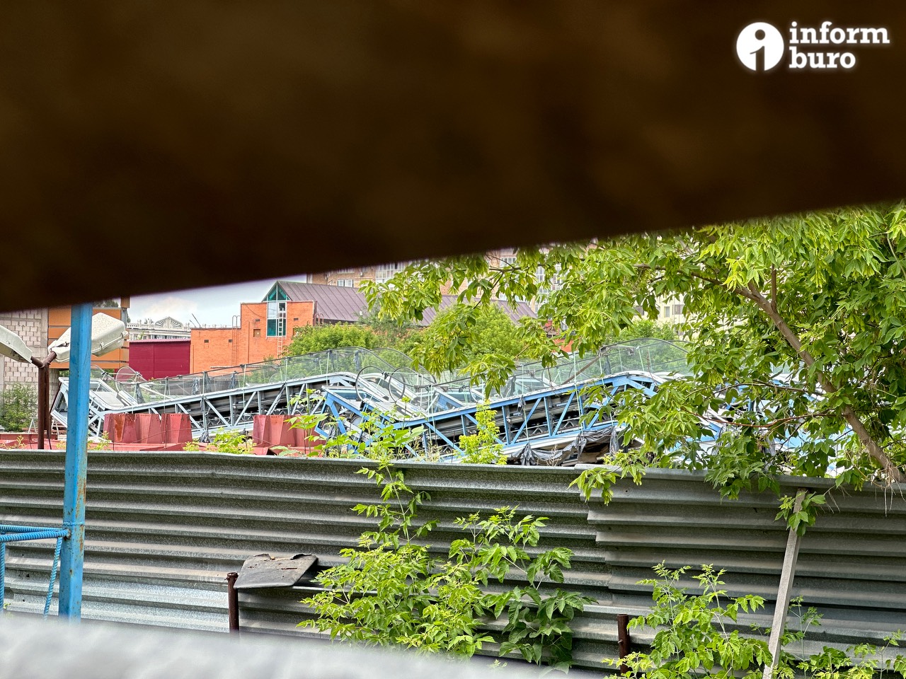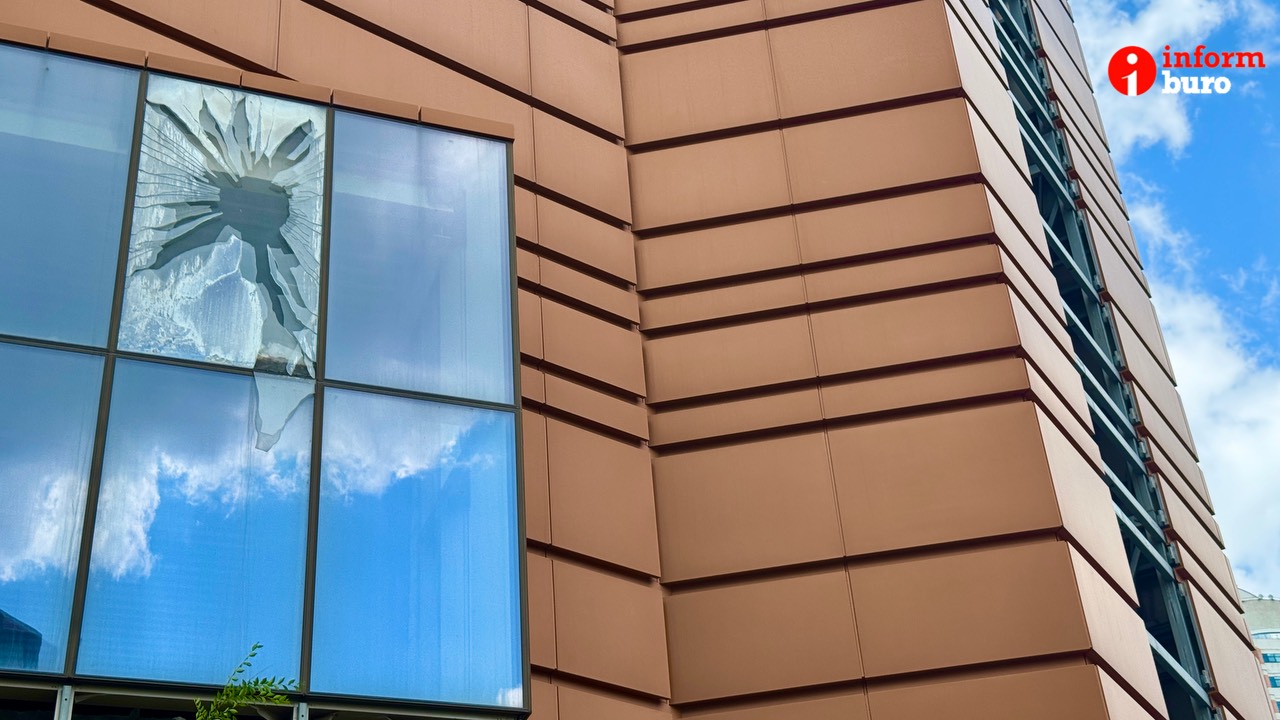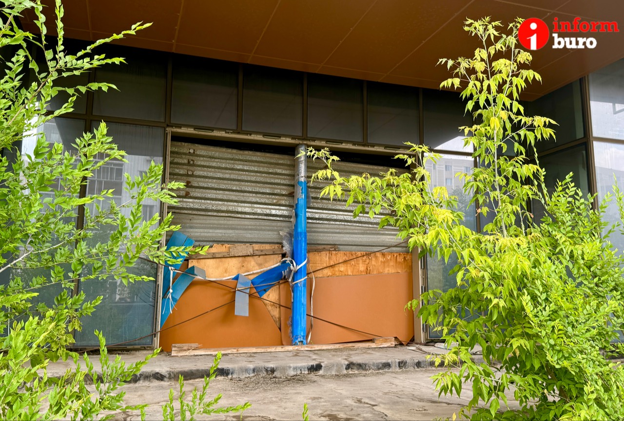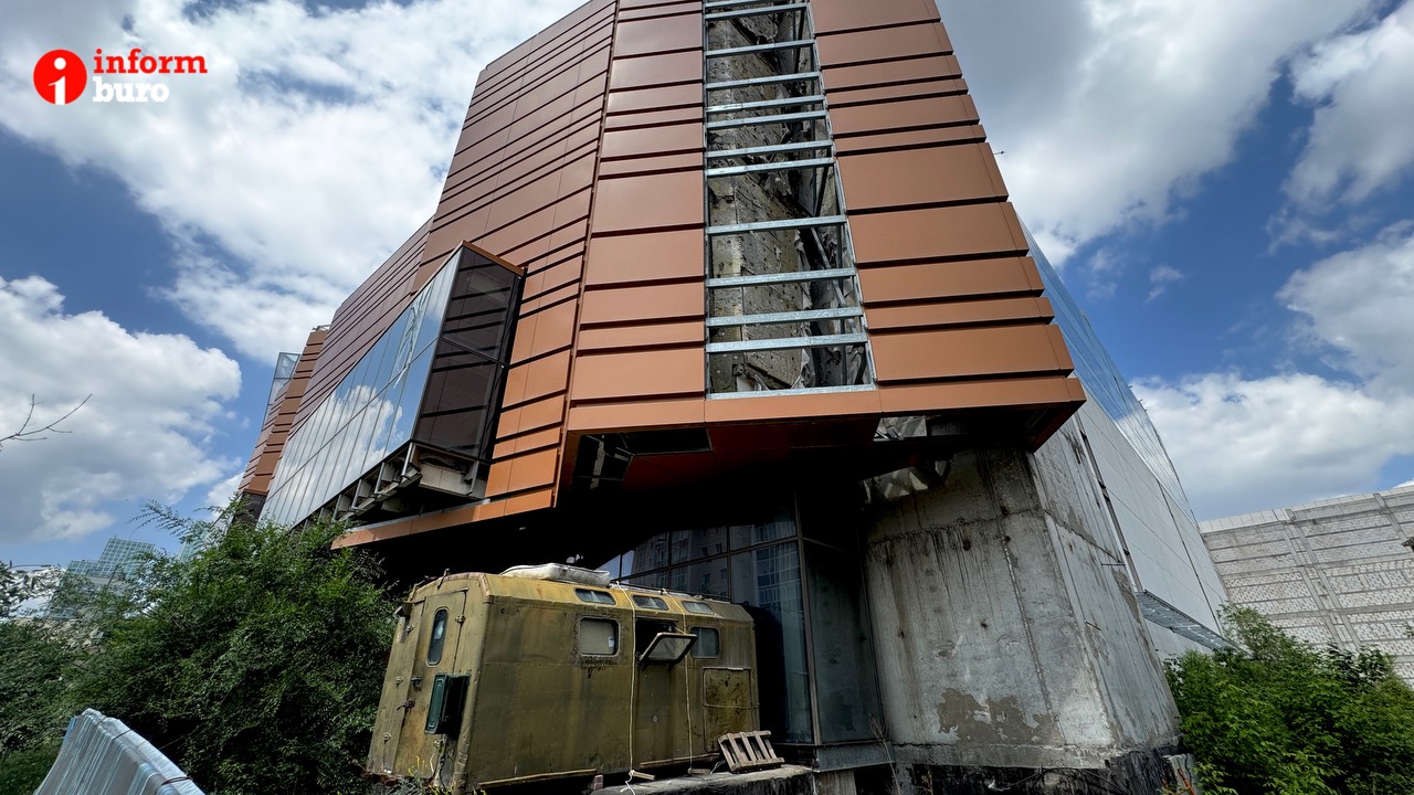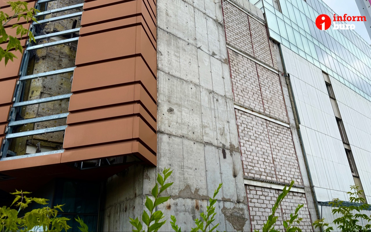 Тем временем здание разрушается на глазах. На месте панорамных окон – разбитые стёкла с трещинами. Фасад частично лишился облицовки. Местами виднеются обнажённые бетонные и кирпичные панели, в том числе с видимыми следами коррозии, влаги и технических дефектов.