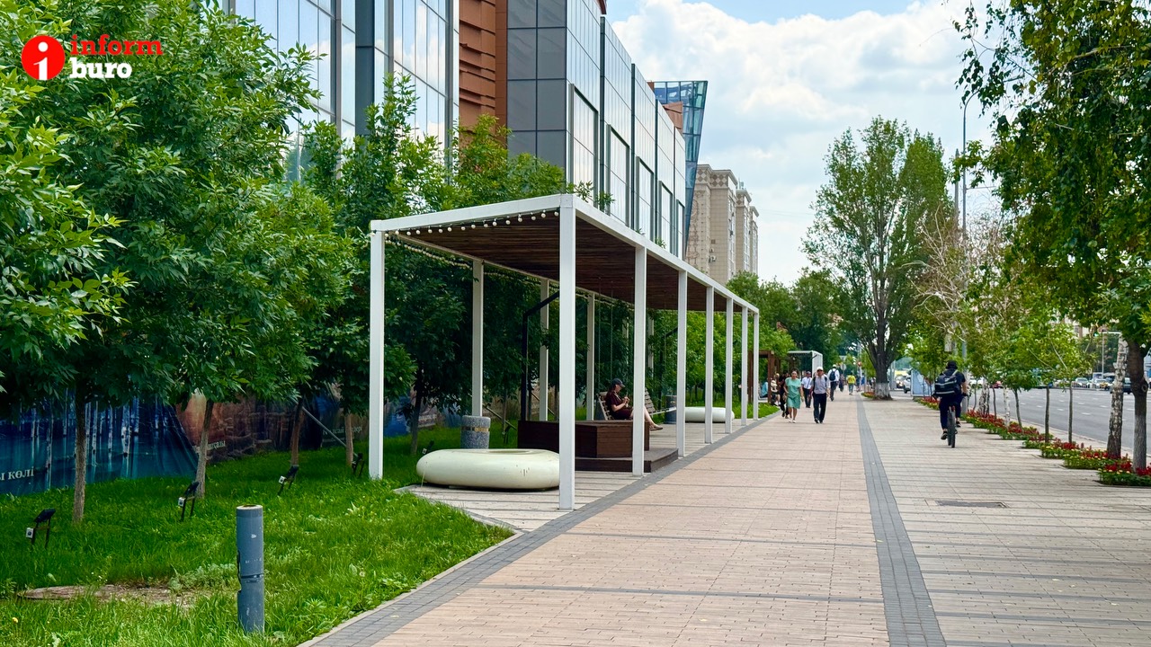 Акимат облагородил пешеходную зону перед ТРЦ со стороны проспекта Республики. Здесь установили лавочки и качели.
