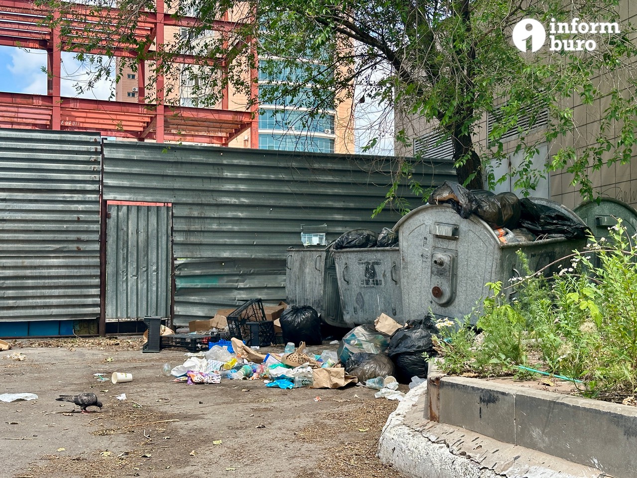 При этом сбоку от ТРЦ, на улице Иманова, расположены торговые киоски. За ними скрываются запертый вход на территорию стройки и переполненные контейнеры – мусор, похоже, не вывозили уже несколько дней.