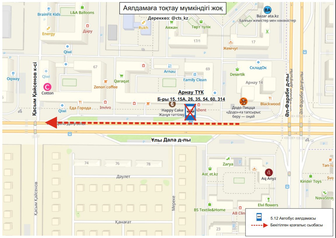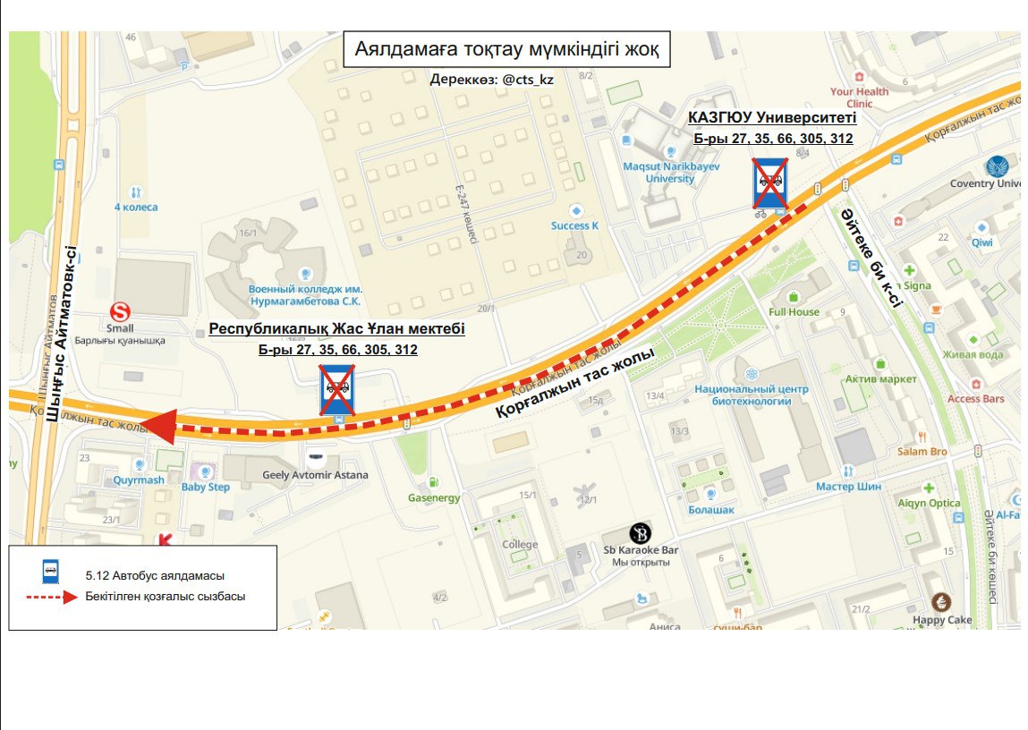 Маршруты № 27, 35, 66, 305, 312 временно не осуществляют посадку/высадку пассажиров на остановочных пунктах "КАЗГЮУ Университеті", "Республикалық Жас Ұлан мектебі".