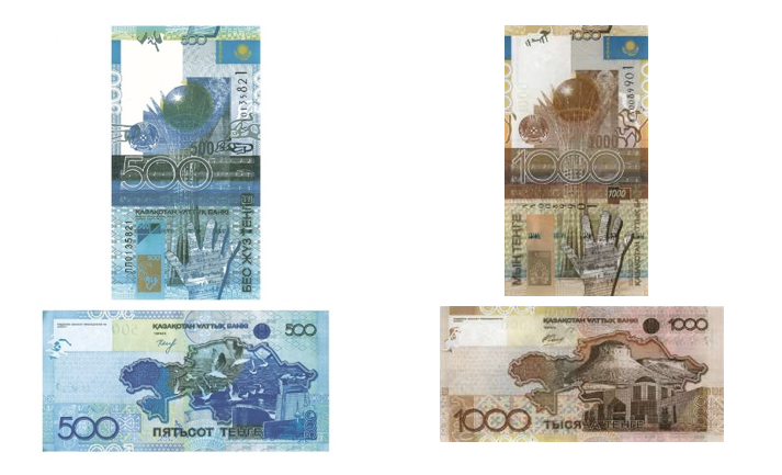Купюры образца 2006 года номиналами 500 и 1000 тенге