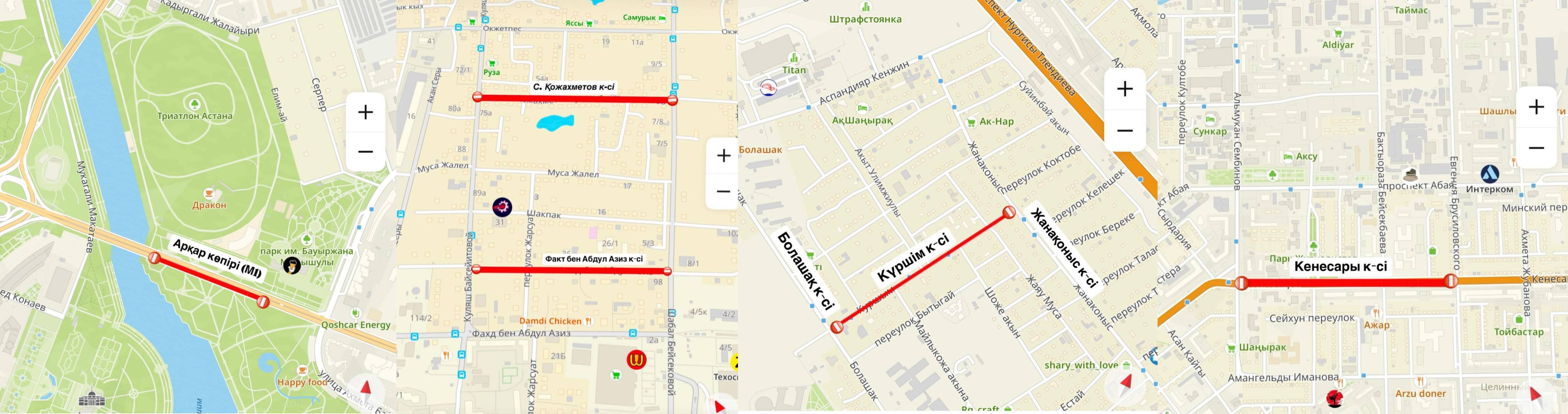 - с 11 по 18 мая – улица Куршым на участке от улицы Болашак до улицы Жанаконыс (движение для автомобилей обеспечили по одной из сторон в обоих направлениях);