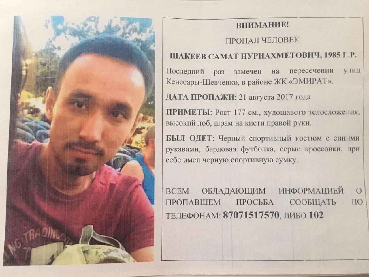 Всех, кто владеет информацией о месте нахождения Самата Шакеева, просят позвонить его супруге Салтанат по номеру 8 707 151 75 70 или 102.