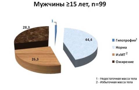 Среди 15-19-летних мужчин у 14,3% обнаружено ожирение. В группе 50-64 года 84,7% женщин имеют избыток массы тела или ожирение (41,8% и 42,9%, соответственно) и 73,3% мужчин (излишний вес – 23,3%, ожирение – 50%).