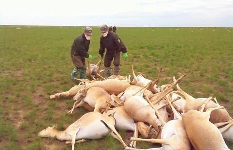 Напомним, популяция сайгаков в Казахстане резко сократилась вследствие массовой гибели от неизвестной инфекции. Древние антилопы гибнут в Костанайской, Актюбинской и Акмолинской областях. Количество павших животных достигло 85 тысяч. Уже появились разные версии экологической катастрофы - от воздействия НЛО до браконьеров, которые якобы убивают сайгу, чтобы нажиться на рогах. Но главная версия, которой придерживаются специалисты, - это пастереллез.