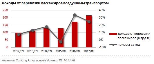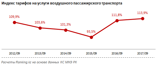 "В прошлом году на фоне резкого ослабления национальной валюты тарифы на авиаперелёты также существенно выросли, и под влиянием этого факта казахстанцы ограничили себя в поездках воздушным путём. Стоимость перелёта за январь-сентябрь 2016 года подорожала на 11,8%. При этом снижение уровня пассажирооборота в прошлом году не сказалось на доходах: напротив, выручка от перевозок пассажиров увеличилась на 33,9% и составила 173,3 миллиарда тенге", – пишет ranking.kz.