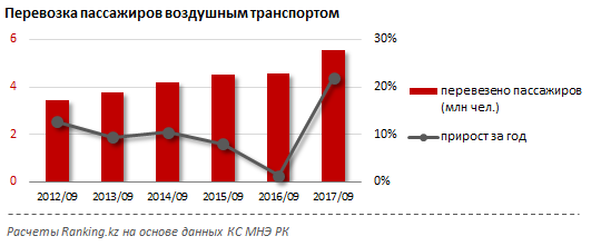 За девять месяцев текущего года казахстанские авиакомпании перевезли порядка 5,6 миллиона человек, что на 22%, или на 1 миллион человек больше, чем было перевезено за аналогичный период прошлого года. В прошлом году, наоборот, наблюдался спад потребительского спроса на авиауслуги. Численность перевезённых за январь-сентябрь 2016 года пассажиров сократилась на 1,3% по сравнению с уровнем годом ранее.