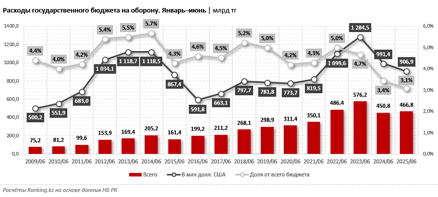 С января по июнь оборонные расходы Казахстана составили около 467 млрд тенге. В первом полугодии прошлого года было менее 451 млрд тенге. Однако при сопоставлении в долларах оборонные расходы снизились на 8,5%, отмечают аналитики.