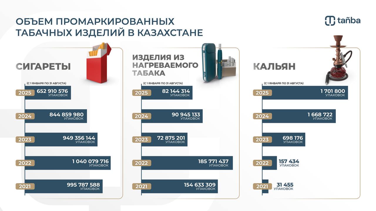 Из статистики системы Единого оператора маркировки Tañba следует, что основной объём сигарет на казахстанском рынке приходится на отечественное производство. С начала года промаркировано 581 млн упаковок, произведенных в стране. В целом производство и импорт составили 626 млн упаковок, при этом наибольшие объемы поставок поступили из Узбекистана, России и Германии.