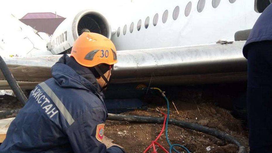 Спасатели Комитета по чрезвычайным ситуациям МВД РК и работники алматинской службы спасения ведут работы по перекачке авиационного топлива из крыла разбившегося самолёта.