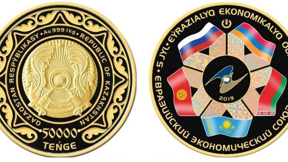 Национальный банк Казахстана выпустил в обращение коллекционные монеты "Евразийский экономический союз. 5 лет" из золота номиналом 50 тысяч и 500 тенге, а также из серебра номиналом 500 тенге.