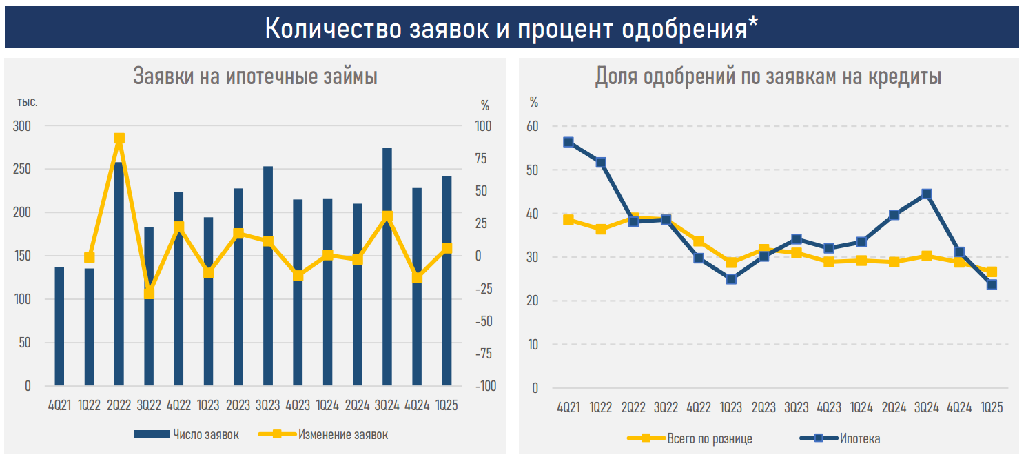 Из данных следует, что объёмы выдачи ипотечных кредитов снизились после бурного роста в 2024 году.