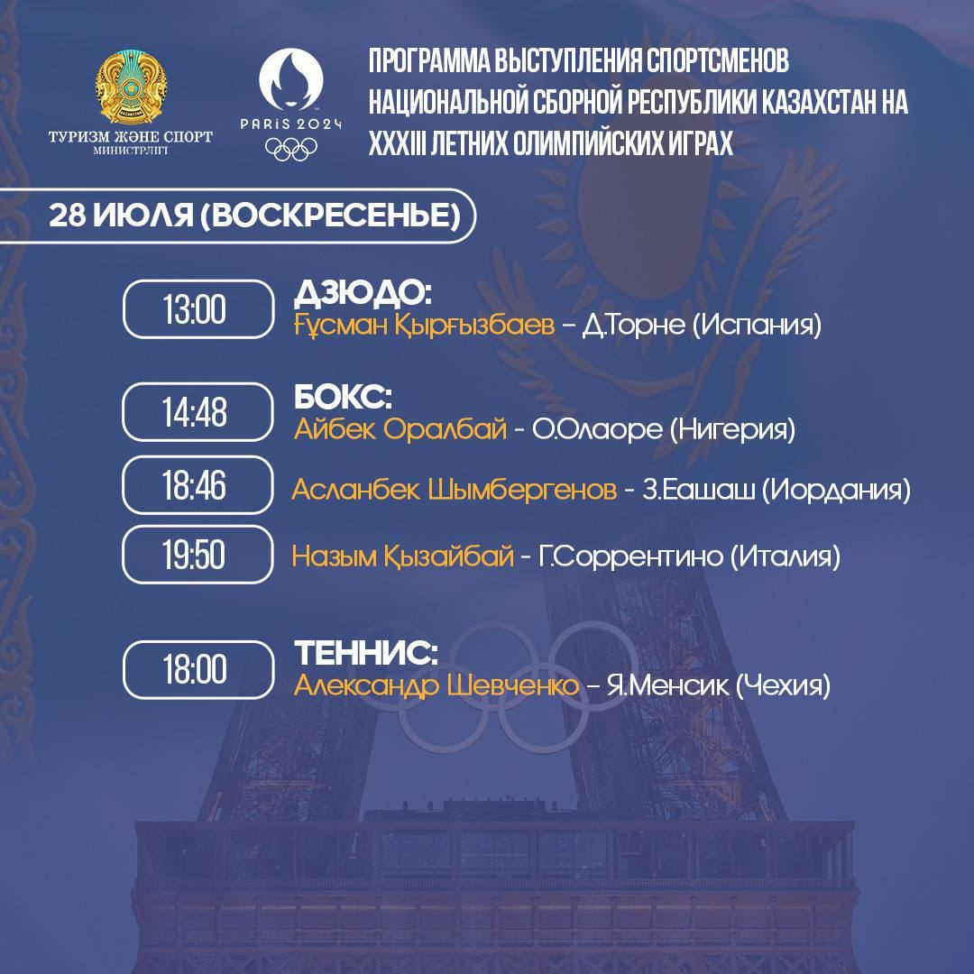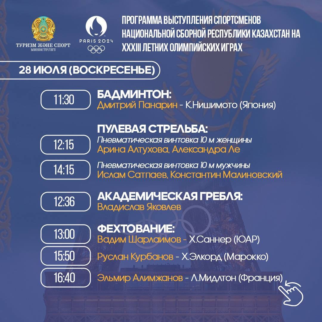 Сегодня, 28 июля, на Олимпиаде в Париже выступят 14 казахстанских спортсменов в восьми видах спорта – бадминтон, академическая гребля, пулевая стрельба, дзюдо, фехтование, теннис, настольный теннис, бокс.
