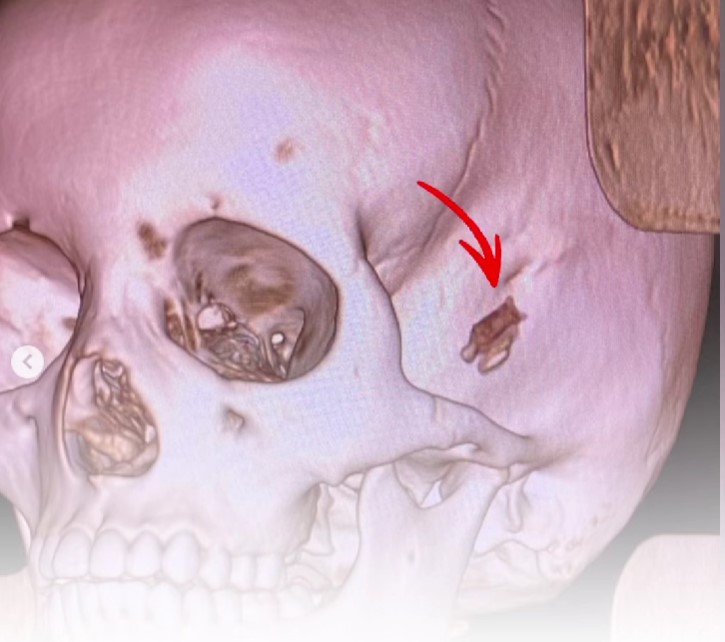 "В Павлодаре они обратились к хирургу по месту жительства, было выполнено УЗИ мягких тканей, где выявили кальцинат (участок уплотнения, связанный с отложением солей кальция). После этого ребёнка направили на осмотр к нейрохирургу. В травмпункте после осмотра нейрохирургом была рекомендована экстренная госпитализация для оперативного лечения. Ребёнку провели все необходимые подготовительные анализы и КТ головного мозга, где было обнаружено инородное тело. При осмотре отмечался отёк левой височной области, а при пальпации в области скуловой кости – твёрдое, подвижное образование", – рассказали в областной больнице Павлодара.