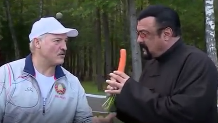 Александр Лукашенко встретил Стивена Сигала дарами своей страны: овощами - сырой морковью и варёным тёплым картофелем, а также вручил гостю спелый арбуз.