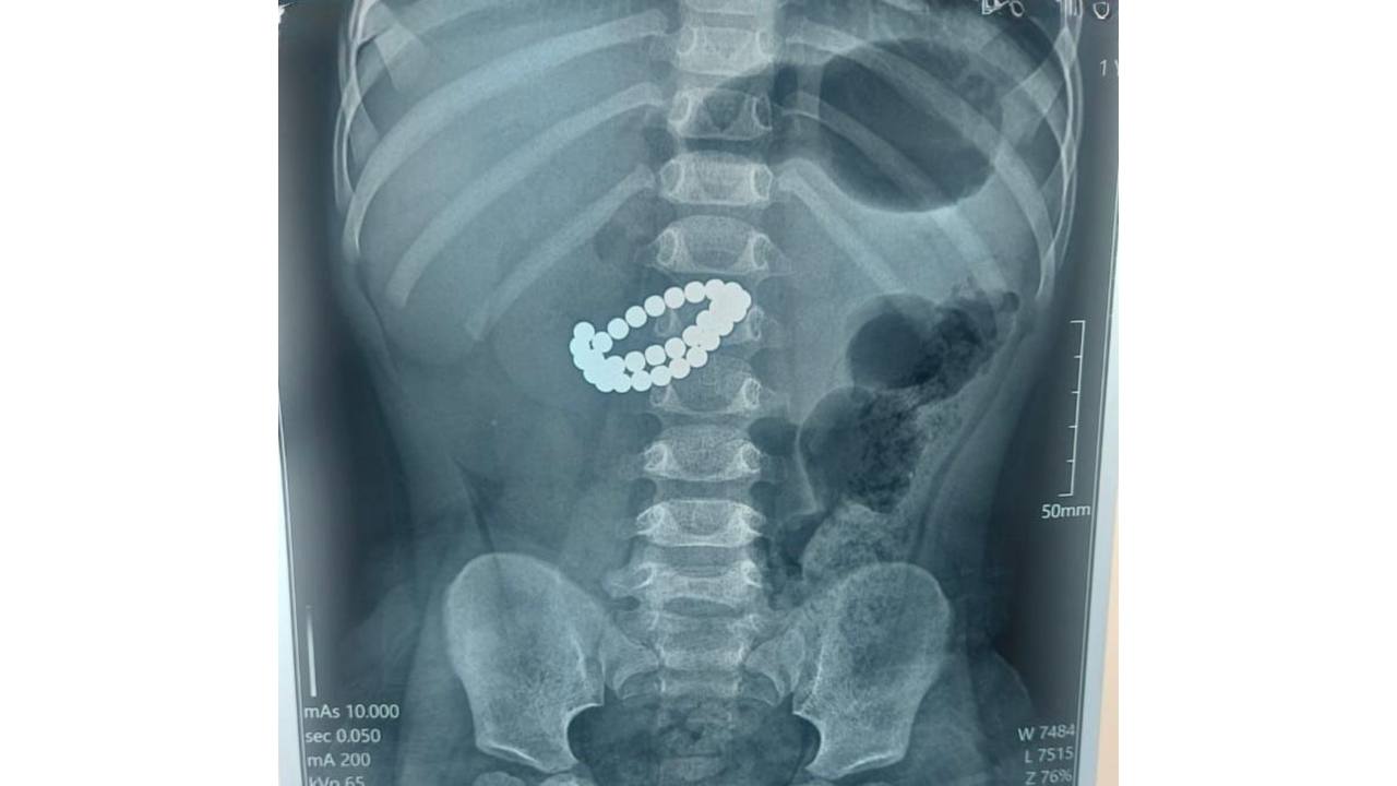 Малыш в возрасте 1,9 лет поступил в приёмное отделение в критическом состоянии. Обследование показало, что внутри кишечника находился 31 магнит. Врачи диагностировали множественные перфорации тонкой кишки (отверстия в стенке кишечника) и диффузный каловый перитонит (острое воспаление брюшины).