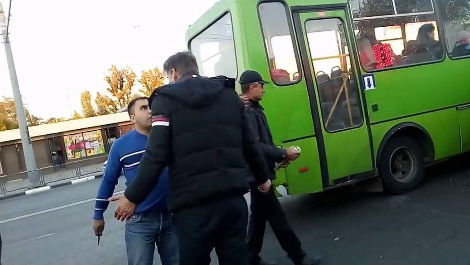 Молодой человек разнял дерущихся. К этому моменту к месту драки уже подоспели и кондуктор автобуса – девушка в форменной одежде, и пассажиры. Утихомиренный водитель автобуса ещё некоторое время пытается сопротивляться, а потом размахивает руками, что-то объясняя.