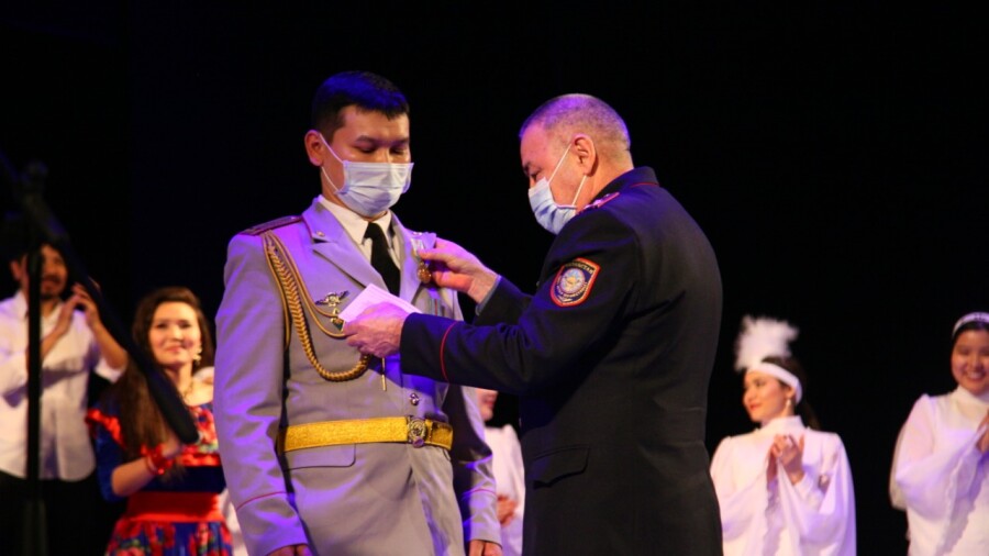 Церемония награждения прошла в областном казахском театре драмы имени Омарова. Заместитель начальника Департамента полиции Костанайской области Ардак Ынтыкбаев вручил медаль "Құқық тәртібін қамтамасыз етуге қосқан үлесі үшін" инспектору службы батальона патрульной полиции УП Костаная Амантаю Байжанову.