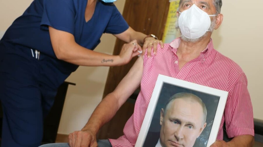 Мэр аргентинского города Роке Перес Хуан Карлос Гаспарини вакцинировался от коронавируса с портретом президента России Владимира Путина в руках.