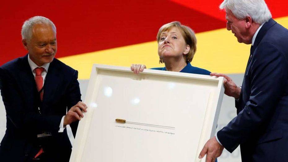 Подарок Меркель вручил премьер-министр земли Гессен Фолькер Буфье, который сравнил её председательство в партии с обязанностями дирижёра.