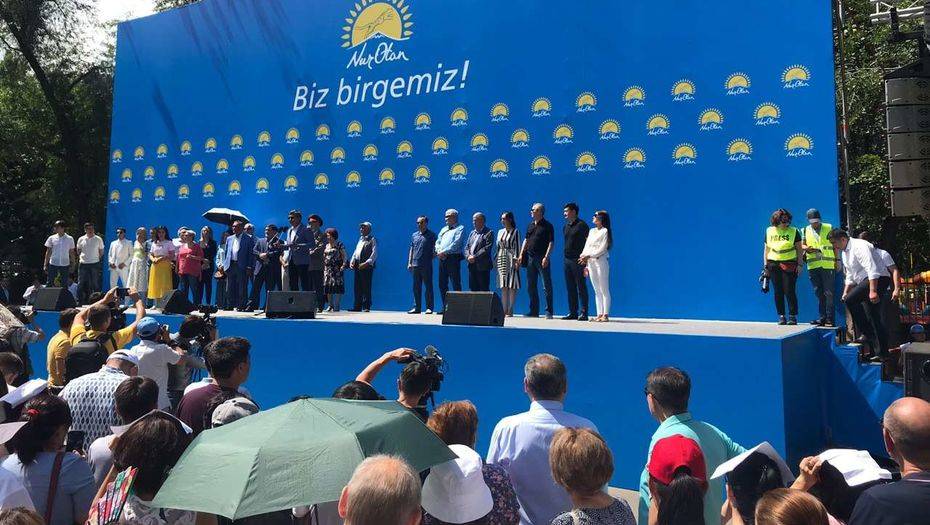 Собравшиеся выступали на фоне баннера партии "Нур Отан".