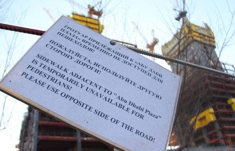 "В связи с возникшей угрозой обрушения скользящей опалубки на объекте "Абу-Даби Плаза", руководством филиала компании Arabtec Consolidated Contractors Limited совместно с уполномоченными органами в целях обеспечения безопасности движения пешеходов с южной стороны улицы Сыганак, на участке от улицы Акмешит до улицы Туркестан принято решение об ограничении движения пешеходов путём установки временных ограждений и запрещающих дорожных знаков (3.10 "Движение пешеходов запрещено". - Авт.)", - сообщили в Департаменте внутренних дел Астаны в ответе на официальный запрос informburo.kz.