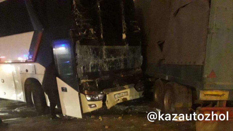 В это время в сторону Алматы ехали два пассажирских автобуса. Водитель первого автобуса заметил впереди ДТП и начал останавливать транспортное средство. Тем не менее полностью предотвратить удар не удалось и автобус врезался в боковую часть КамАЗа. Второй автобус, не соблюдая дистанцию, въехал в первый.