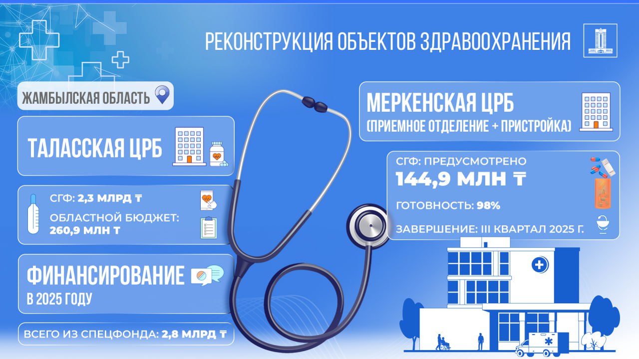 В 2025 году из Специального государственного фонда на реализацию четырёх объектов здравоохранения в Жамбылской области направили 2,8 млрд тенге. Ранее сообщалось о строительстве двух врачебных амбулаторий в Кордайском и Таласском районах. Каждая из них рассчитана на 45 посещений в сутки.