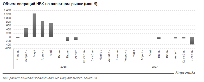 Нацбанк вернулся к интервенциям в августе, но те объёмы продаж долларов из валютных резервов не смогли снизить радикально спрос на инвалюту. В октябре же объёмы интервенции были более масштабными, и курс снизился за месяц на 1,9%.