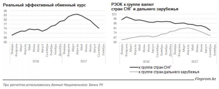 Давление внешних факторов на курс тенге пока не столь сильное, как это было в первой половине 2015 года, или ранее – в 2008-2009 годах. Стоимость тенге по отношению к валютам основных торговых партнёров существенно ниже, реальный эффективный обменный курс тенге хотя и поднимался с сентября 2016 года, но достиг максимума всего в 81,5 в марте 2017 года. На текущий момент уровень реального обменного курса (на конец сентября) составляет 70,3 – самый низкий показатель за последние 12 месяцев.