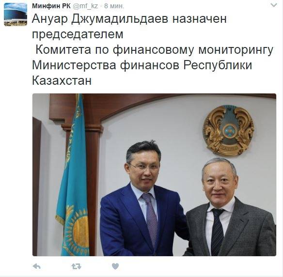 Министерство финансов Казахстана сообщило о назначении на своей странице в Twitter.